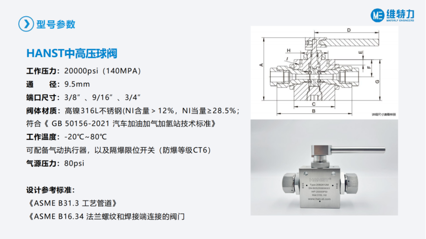 此刻PPT展示的数据是目前我们做的一个球阀的数据 ,壹定发官网设计规划是依照140Mpa ,也就是20000psi来做的 ,通径是9.5mm ,单孔尺寸提供3/8 "、9/16"、3/4"可选 ,目前加氢站常用的规格尺寸都能够提供 ,球阀阀体材质满足现行的行业尺度42177对于阀门资料的要求 ,镍含量大于12% ,镍当量不低于28.5%。工作温度区间是-20℃~80℃ ,这个温度领域我们针对的压力等级是140Mpa ,若是压力降到目前加氢站压力等级70Mpa的话 ,我们温度可进一步做到-40℃。图片上展示的球阀是手动球阀 ,我们也能够提供气动球阀并建设气动执行器和隔爆型的限位开关。